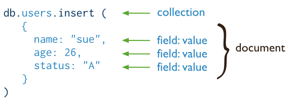 우선 Document부터 보면 아래와 같이 기본 데이터 단위로 RDB 기준으로 행과 유사한 개념이다. BSON 형식에 저장된 필드와 값 쌍으로 구성된다.