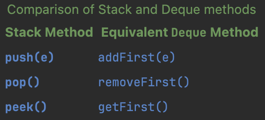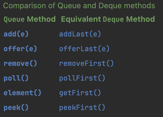 | offerFirst() | 맨 앞에 원소 삽입 삽입 성공 시 true, 용량 제한에 걸리는 경우 false 반환 |