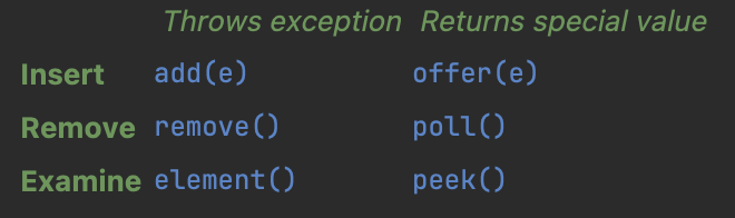 | offer() | 마지막에 원소 삽입 삽입 성공 시 true, 용량 제한에 걸리는 경우 false 반환 |