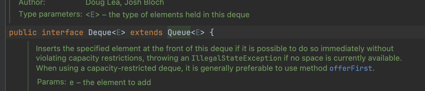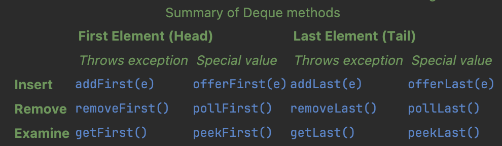 그렇다면 아까 Queue의 구현체인 LinkedList가 구현하고 있는 Deque 인터페이스에 대해서도 알아보자.