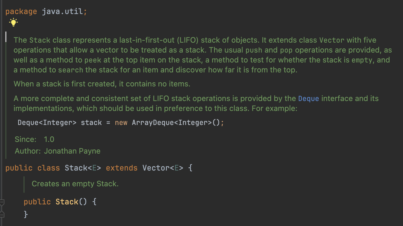 | Object peek() | Stack의 맨 위에 저장된 객체를 반환. pop()과는 달리 Stack에서 객체를 꺼내지는 않는다. ( 비었다면 EmptyStackException발생 ) |