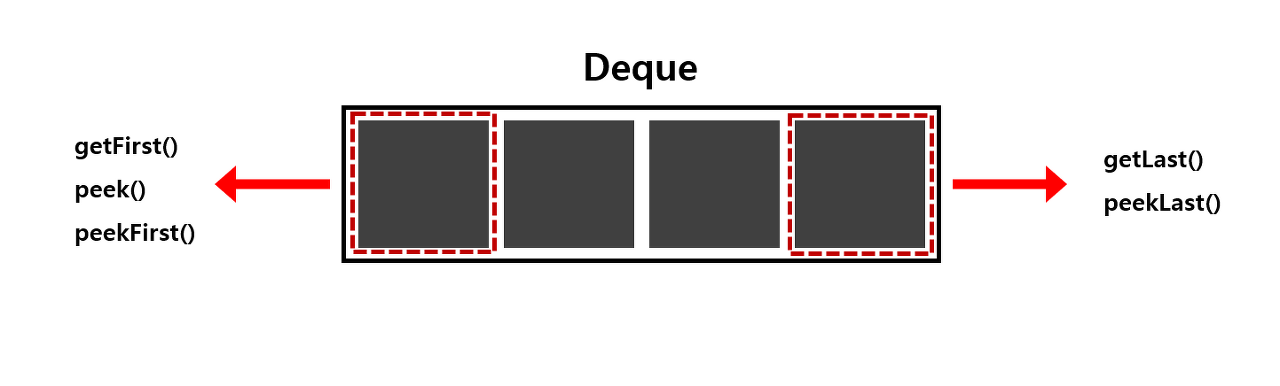 | peekFirst() | 맨 앞의 원소를 리턴 덱이 비어있는 경우 null 리턴 |