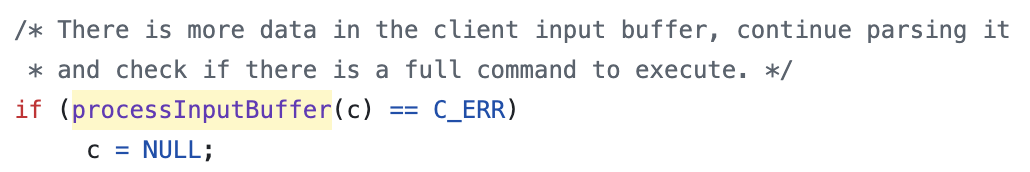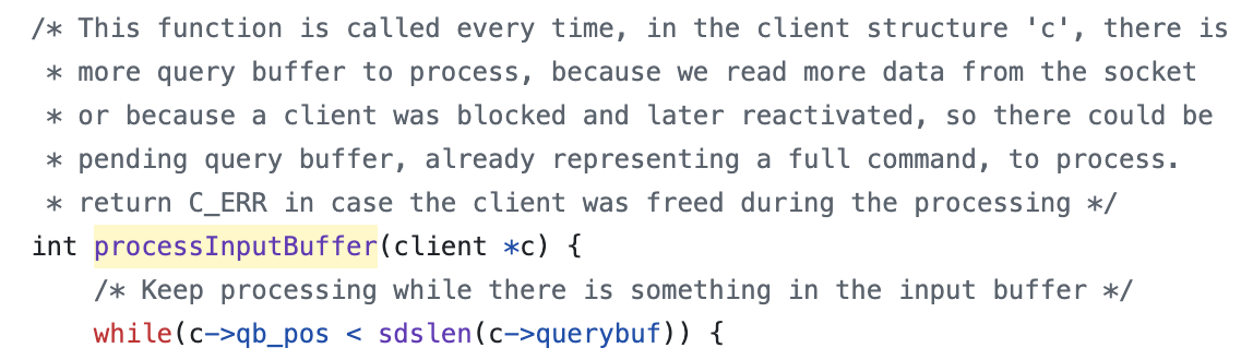 이제 소켓에서 데이터를 read한 후 client 구조체의 queryBuf(읽기 버퍼)에 완전한 명령어가 있는지 processInputBuffer()를 호출하면서 계속 확인한다.