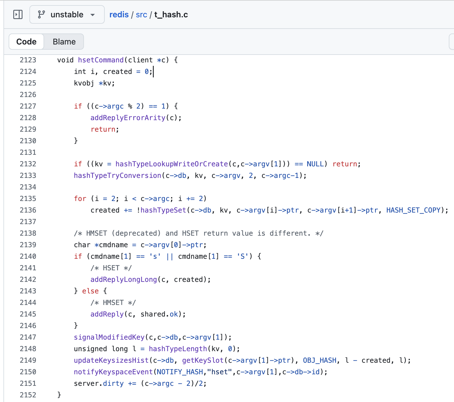 자, 예시로 보려는 hsetCommand도 역시 redis/src/t_hash.c에 구현되어 있다.