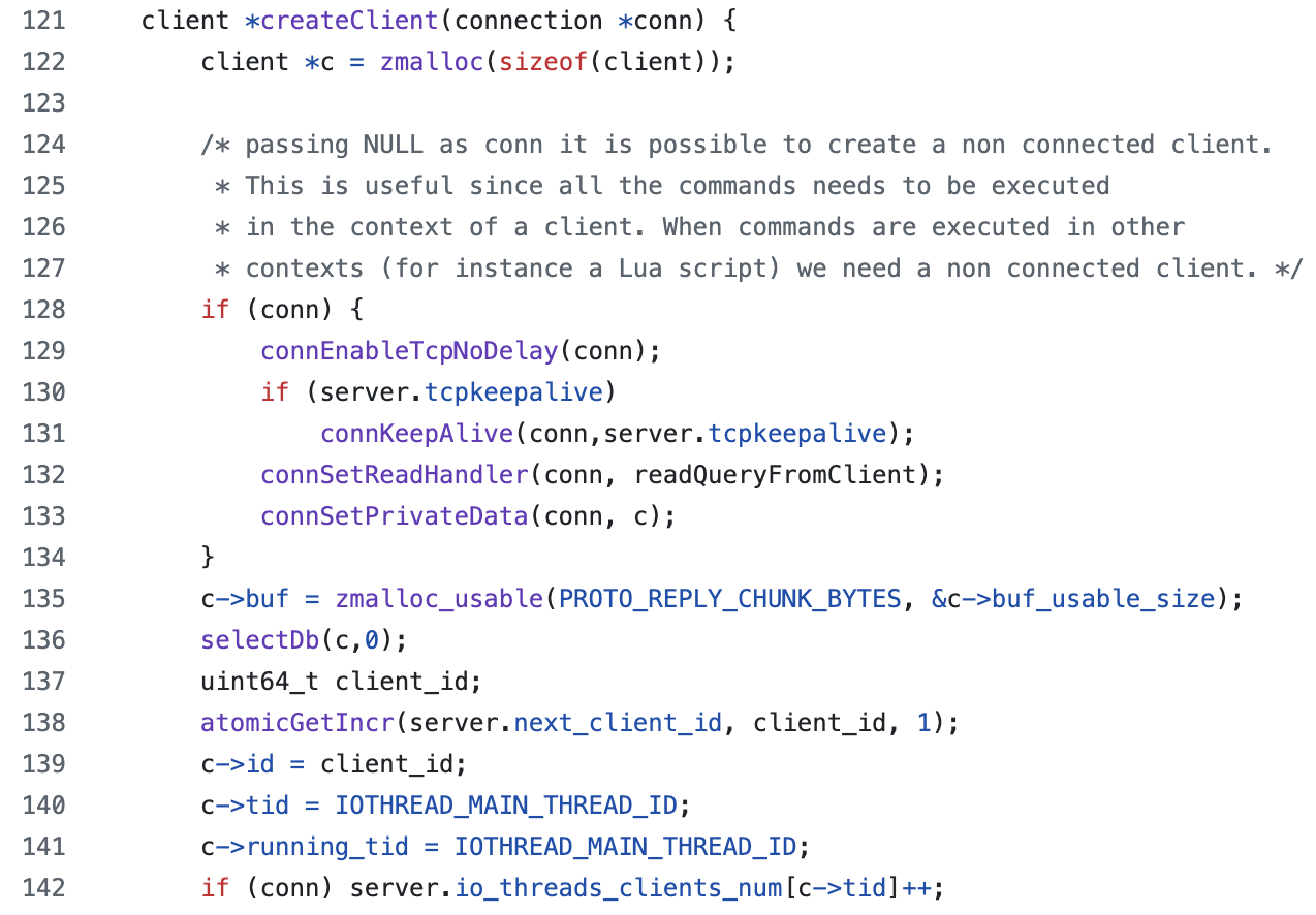 redis/src/networking.c의 client *createClient(connection *conn)로 Redis에서 클라이언트 하나가 연결될 때마다 독립적인 client 구조체 생성한다.