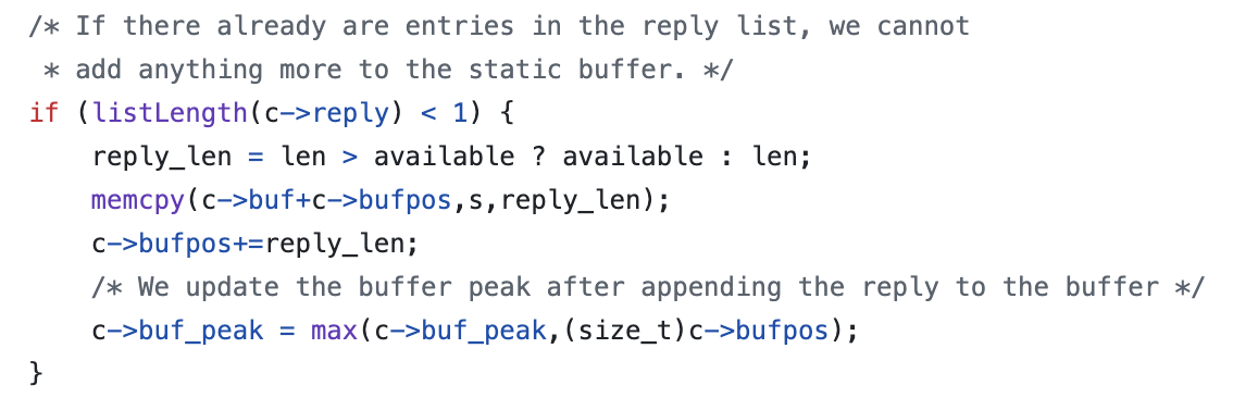 - memcpy(c->buf + c->bufpos, s, reply_len)가 실제로 데이터를 버퍼에 복사하는 부분