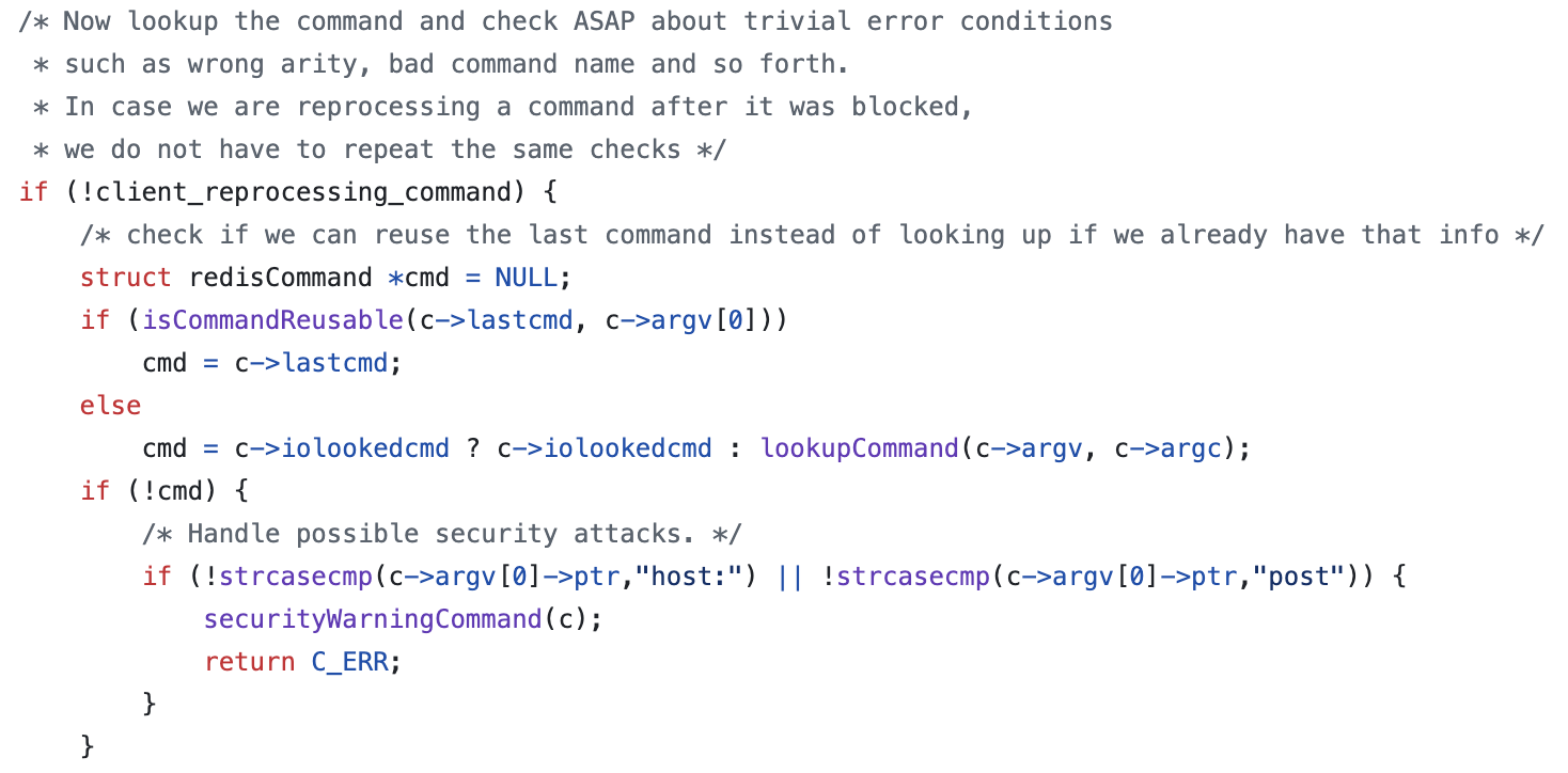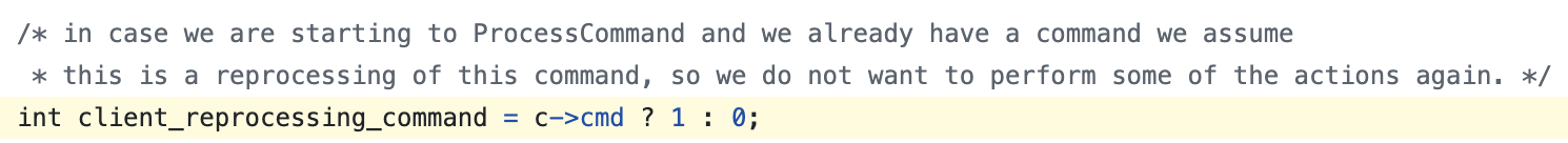 해당 부분을 보면 우선 if(!client_reprocessing_command)에서 client_reprocessing_command는 아래에서 알 수 있듯이 c->cmd이다.