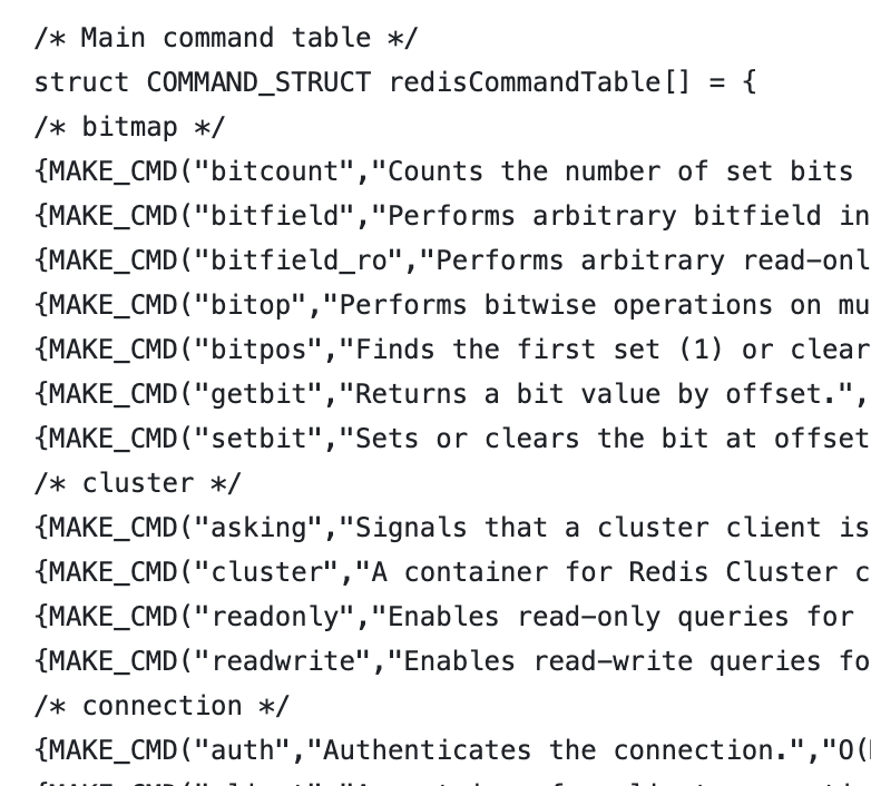 또 다시 redisCommandTable 배열을 순회한다고했을때 해당 Table은 redis/src/commands.def에서 작성된 명령어 정보들을 기반으로 초기화되는데 해당 파일을 보면,