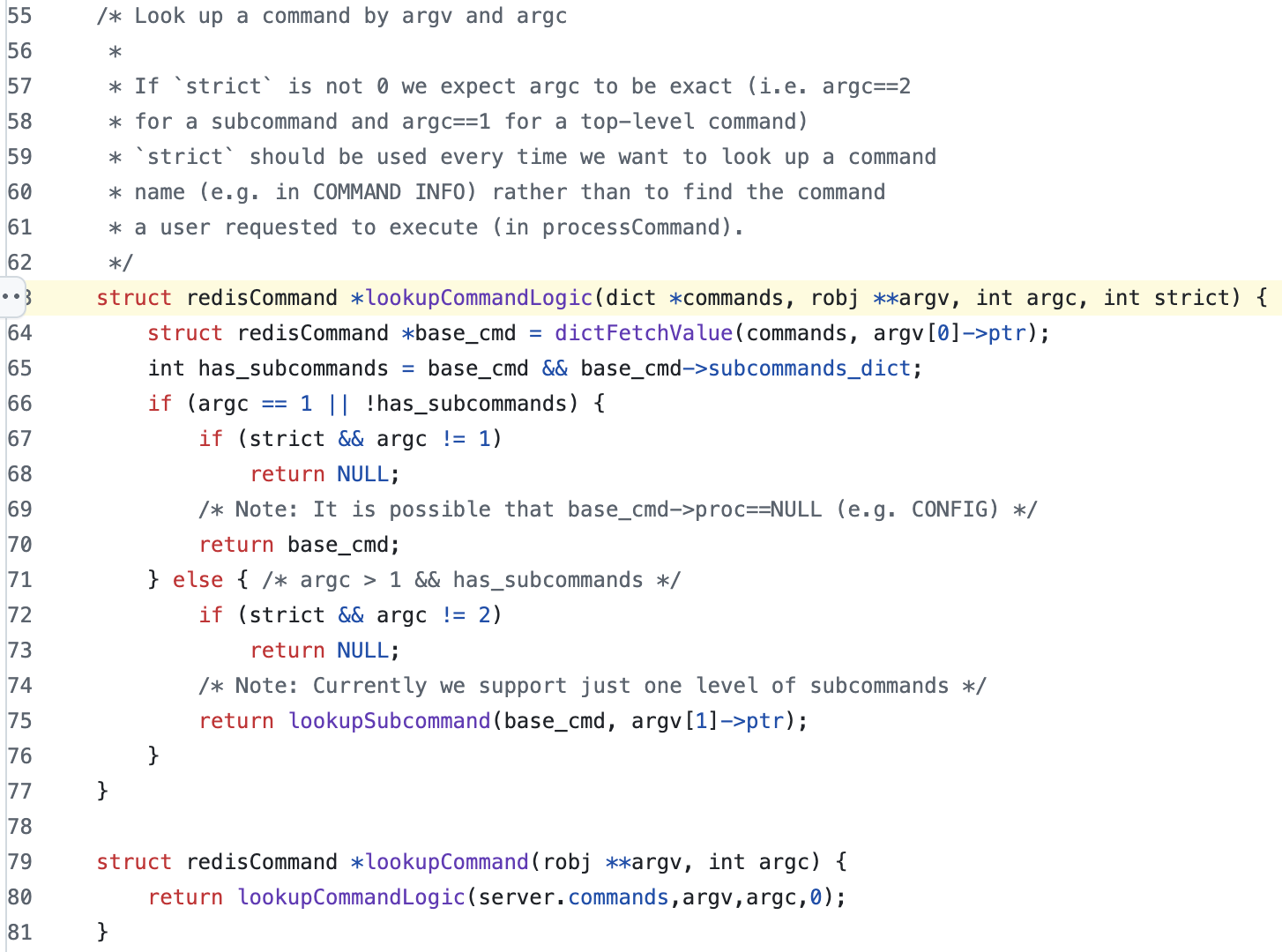 lookupCommand()에서는 다시 lookupCommandLogic()을 호출하는데 이때, server.commands라는 dict *commands와 int strict가 추가로 인자로 넣어주는데