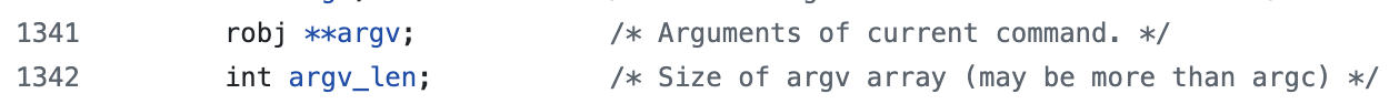 - c->argv의 argv는 명령어와 인자들의 배열으로 예시로 다음을 들 수 있다. ex) ["SET", "foo", "bar"]