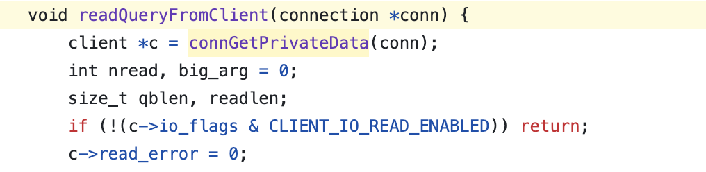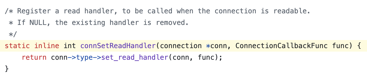 그 다음 connSetReadHandler(conn, readQueryFromClient);에서 해당 클라이언트 소켓에 읽기 이벤트 핸들러를 등록하는 코드로 이 소켓에 데이터(읽기 이벤트)가 들어오면 readQueryFromClient()를 호출하라는 것이며 TCP 요청의 경우 conn->type은 TCP 관련 구조체가 되어서 TCP 타입의 set_read_handler()가 호출된다.