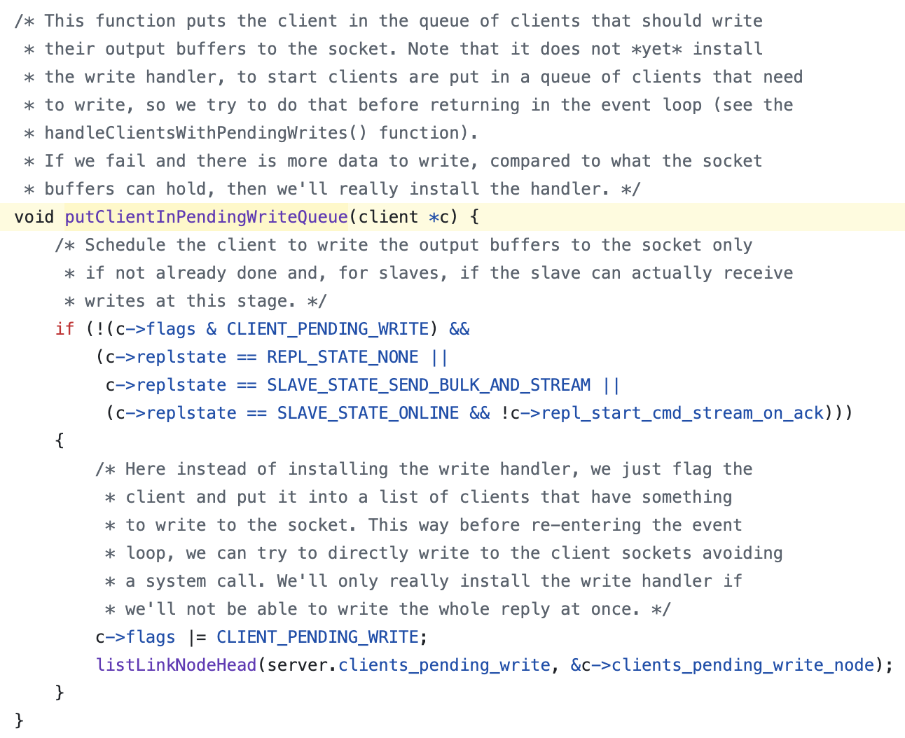 clientHasPendingReplies(c)는 이미 쓰기 이벤트가 등록돼 있는지 확인하는 것. 즉, 쓰기 이벤트가 등록되지 않았다면 putClientInPendingWriteQueue()가 실행된다.