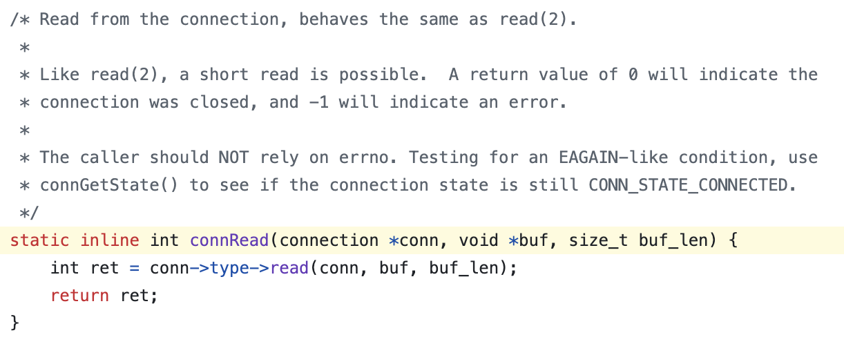 해당 메소드를 통해 Client Socket에서 데이터를 읽어오는데 conn->type에서 연결 유형별(예: TCP, Unix socket) 함수 포인터 구조체로 읽기 함수를 호출하는데 해당 read() 메소드 자체가 system call은 아니고 추상화한 함수 포인터를 통해 호출되는 읽기 함수이다.