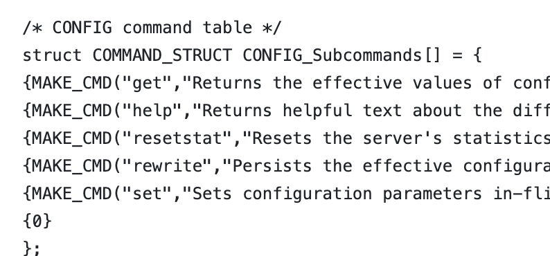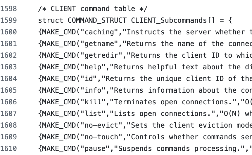 이 함수가 commands.c 안의 정의들을 읽어 Redis 내부 dict(server.commands)에 삽입. - 위 이미지와 같이 commands.c에 commands.def를 include하여 거대한 명령어 테이블인 redisCommandTable을 초기화 시키는 것인데, commands.def가 #include "commands.def"를 통해서 컴파일 타임에 삽입된다.