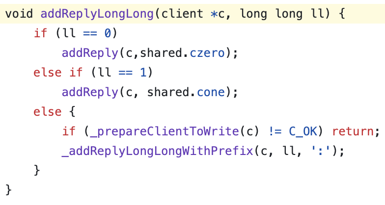 이렇게 두 개인데 오른쪽에서 볼 수 있듯이 addReplyLongLong 또한 내부적으로는 addReply로 처리하는 듯 하다.