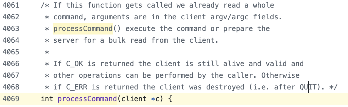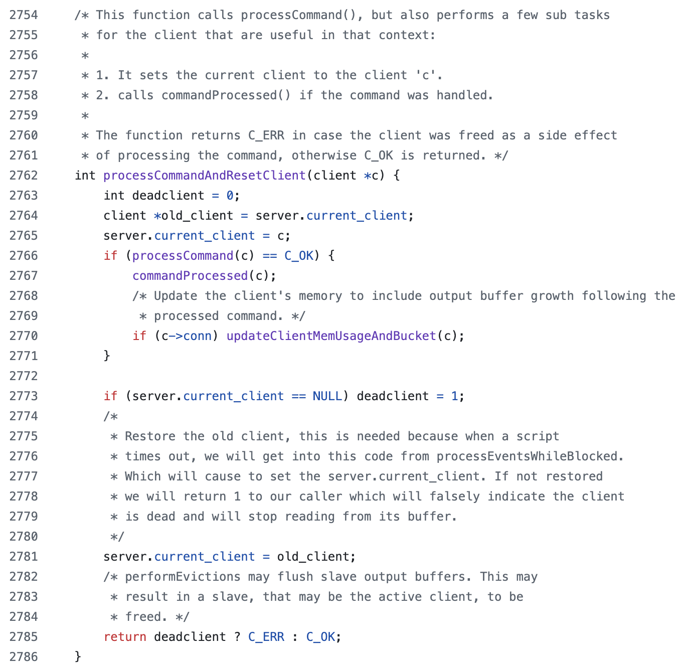 해당 메소드 내부의 processCommand(c)를 통해 실제 명령어를 실행하기 위한 준비 단계 및 검증을 거쳐 실제 명령어를 실행하게 되며 그 후 commandProcessed(c)와 updateClientMemUsageAndBucket(c)를 통해서 서버 통계, 내부 상태 업데이트 및 메모리 사용량 갱신하게 된다.