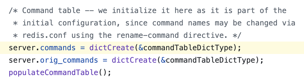 - 서버 시작할 때 initServerConfig() 메소드 내에서 populateCommandTable() (→ server.c)가 호출된다.
