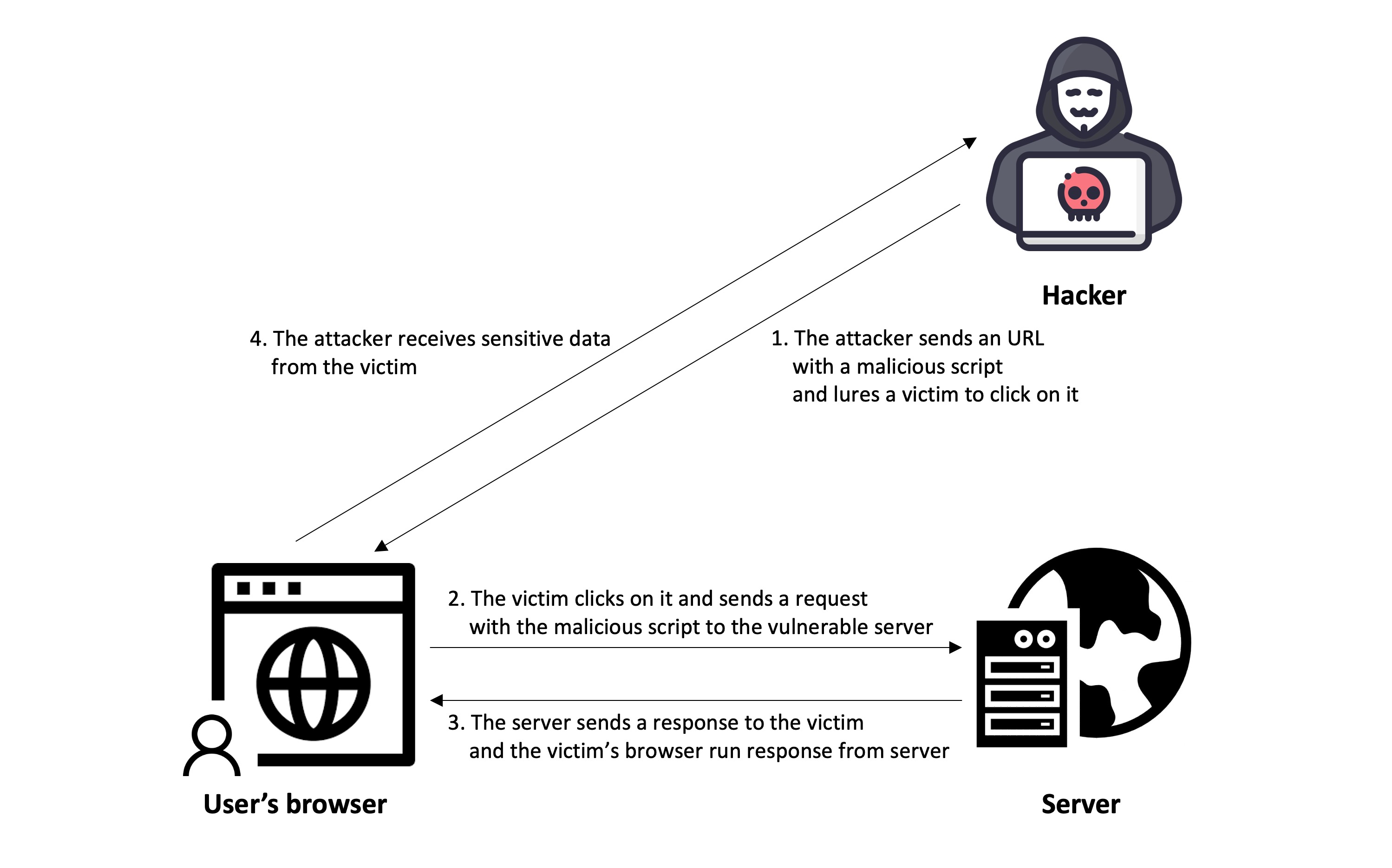 - 일반 유저가 전달받은 URL 링크를 클릭하고 일반 사용자 브라우저에서 보안이 취약한 사이트로 요청이 보내진다. 이때 URL에는 악의적인 스크립트가 파라미터로 담겨있다.