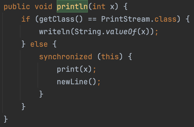 - (성능 저하) System.out은 PrintStream 클래스의 객체인데 그중 println()과 같은 메소드를 살펴보면 "Synchronized"를 포함하고 있다. 이때 PrintStream 객체에 대한 락을 획득하고 하나의 쓰레드가 작업을 완료하면 락을 해제한다. 이는 여러 스레드가 동시에 System.out.println()을 호출할 때, 하나의 스레드만이 println() 메서드를 실행할 수 있고, 다른 스레드는 앞의 스레드가 작업을 완료하고 락을 해제할 때까지 대기해야 한다는 것을 의미하여 잘 못했다가는 많은 Thread들이 이 로그를 남기기 위해 Block될 수도 있다.
