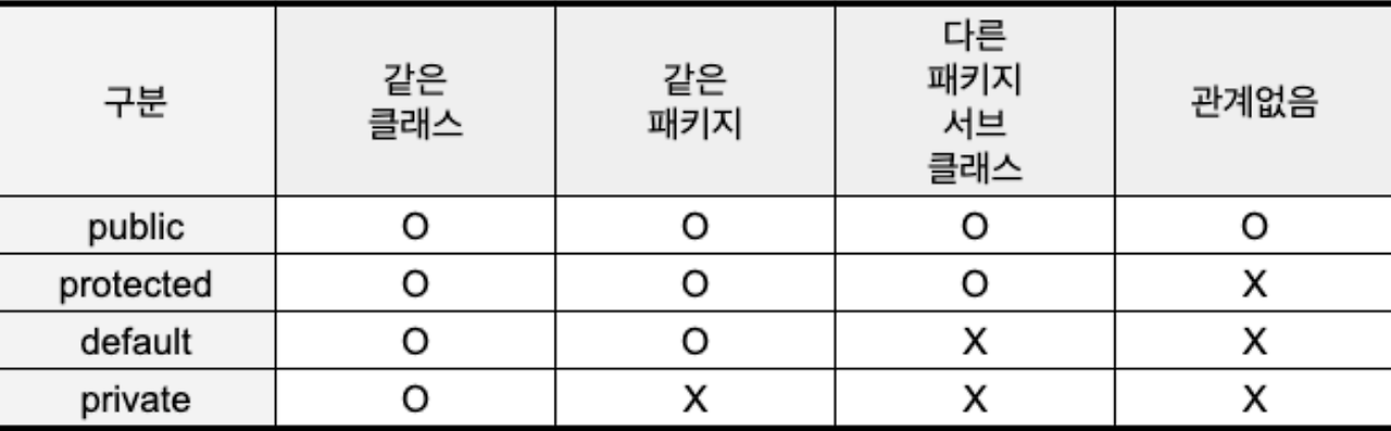 이 3개에 지정할 수 있는 접근제어자로는 4가지가 있다.